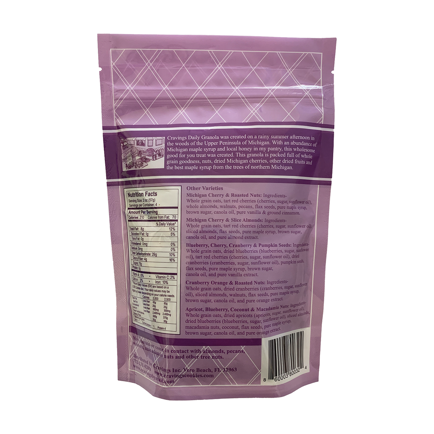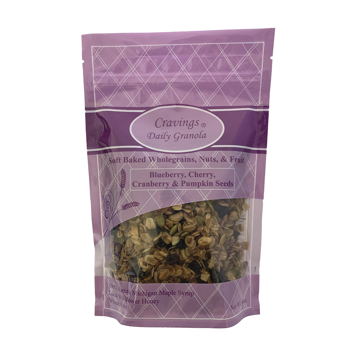 Made with whole grain oats, dried blueberries, tart Michigan cherries, dried cranberries, pure maple syrup straight from northern Michigan, flax seeds, and pumpkin seeds.